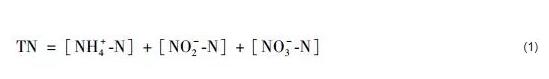 氨氮采用納氏試劑分光光度法;亞硝酸鹽采用N-1-萘基-乙二胺光度法;硝酸鹽采用紫外分光光度法[16];VSS采用重量法測(cè)定;pH值的測(cè)定采用玻璃電極法.總氮采用式(1)進(jìn)行計(jì)算: