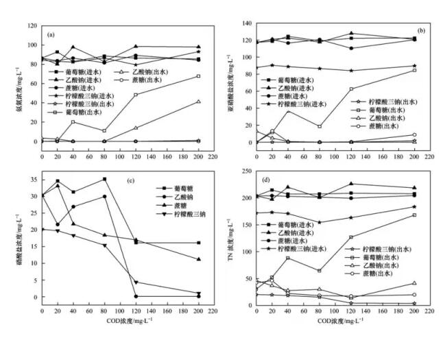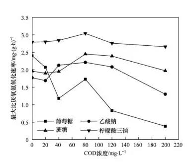 實(shí)驗(yàn)進(jìn)水NH4+-N和NO2--N濃度分別為80 mg˙L-1和120 mg˙L-1.考察4種有機(jī)物葡萄糖、蔗糖、乙酸鈉、檸檬酸三鈉在COD濃度梯度0、20、40、80、120、200 mg˙L-1時(shí)對(duì)厭氧氨氧化反應(yīng)的影響.