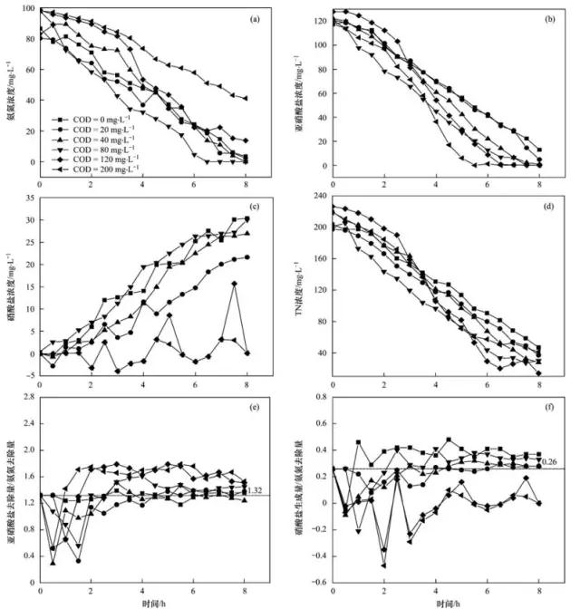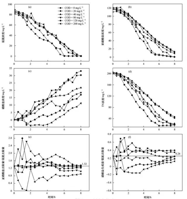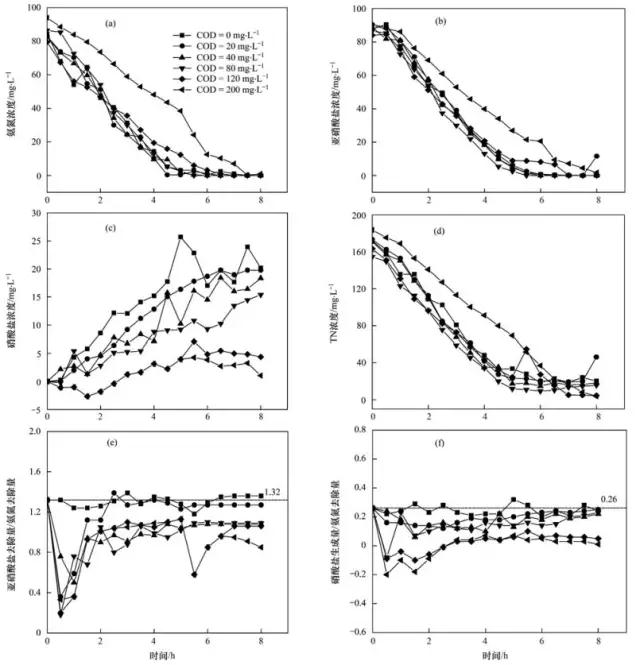 從圖 6(e)、6(f)中可以看出當(dāng)蔗糖濃度大于40 mg˙L-1時(shí),NO2--N與NH4+-N去除量的比值先升高后降低最后接近理論值,而NO3--N生成量與NH4+-N去除量的比值正好相反先降低后升高然后逐漸接近于理論值,而且NO2--N與NH4+-N的比值先升高或NO3--N與NH4+-N的比值先降低的過(guò)程隨著蔗糖濃度的升高逐漸變短.這一過(guò)程與之前葡萄糖和乙酸鈉不同,可能是因?yàn)檎崽歉菀妆环聪趸x.隨著反應(yīng)的進(jìn)行,系統(tǒng)中有機(jī)物被消耗,反硝化作用受到抑制,NO2--N去除量/NH4+-N去除量與NO3--N產(chǎn)生量/NH4+-N去除量的值逐漸接近理論值.