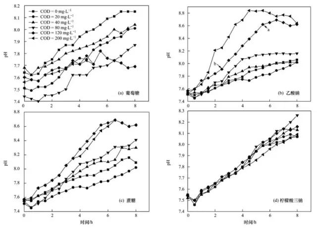 圖 9 不同有機(jī)物作用下厭氧氨氧化系統(tǒng)pH值的變化曲線(xiàn)