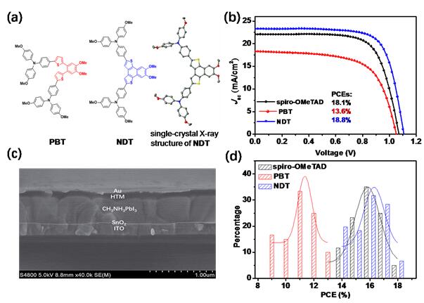 崔彬彬及其合作者設(shè)計(jì)合成了分別以“鄰二噻吩苯”和“萘并雙噻吩”為核心π-bridge的兩種低成本三芳胺類衍生物PBT和NDT(圖1a),并將在這兩種Donor-π-Donor構(gòu)型的有機(jī)小分子作為空穴傳輸層材料應(yīng)用于鈣鈦礦太陽能電池器件(圖1c)中。以基于spiro-OMeTAD分子的PSCs器件(最優(yōu)PCE:18.1%,Reverse)為參照,在同樣條件下,基于PBT的PSCs器件達(dá)到的最大光電轉(zhuǎn)換效率為13.6%,而以相對(duì)于PBT具有更好平面共軛特征的NDT作為空穴傳輸層的PSCs器件最優(yōu)光電轉(zhuǎn)換效率可達(dá)到18.8%(圖1b)。