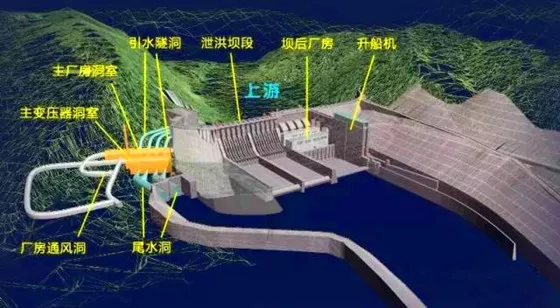 我國的四川省宜賓縣金沙江下游建設(shè)的向家壩水電站采用實體重力壩,最大壩高161米,壩頂長937.5米。水電站除了在靠左岸建設(shè)壩后廠房外,在右岸山體內(nèi)開挖了地下廠房。地下廠房由主廠房洞室與主變壓器洞室組成,4條引水隧洞從上游岸邊連通廠房4臺水輪機(jī),4條尾水隧洞并為2條后通往下游江邊,除此還有進(jìn)廠交通洞、通風(fēng)洞、排水洞、出線洞、母線洞、安全兼施工洞等。