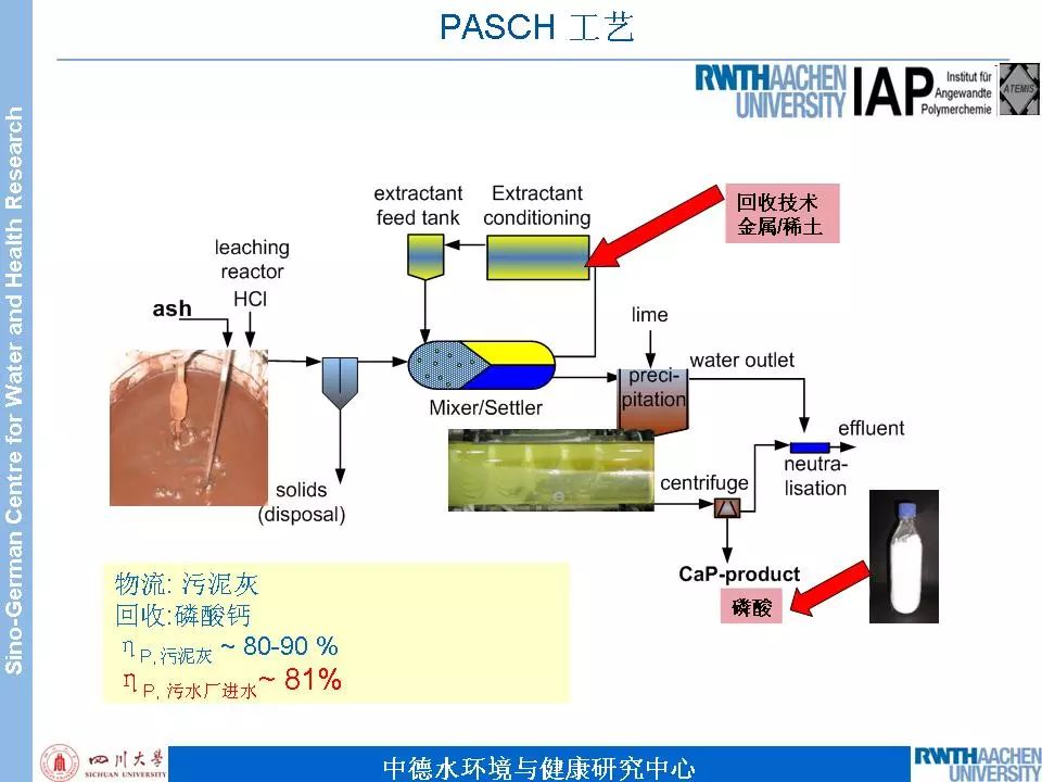 PASCH工藝的特點(diǎn):PASCH工藝是從污泥焚燒的灰分中回收磷。該工藝磷回收率要大于90%;ISA研究所以及FraunhoferIME研究所的研究結(jié)果表明,污泥焚燒過程中有機(jī)污染物已經(jīng)破壞,回收產(chǎn)品的無機(jī)雜質(zhì)含量低,該產(chǎn)品具有良好的植物可利用性;IFEU研究所的研究結(jié)果,與其他回收工藝相比(例如協(xié)同焚燒、污泥直接農(nóng)業(yè)利用等),PASCH工藝的生態(tài)評估具有明顯優(yōu)勢。示范項(xiàng)目運(yùn)行結(jié)果表明,PASCH工藝具有較低的成本。