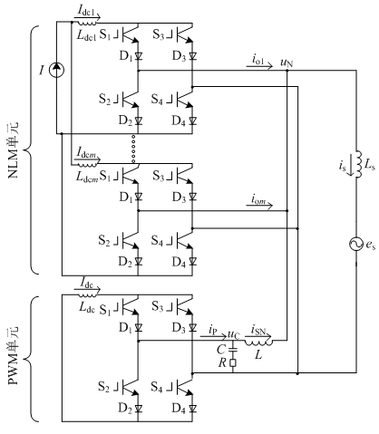 圖1中:I為變流器NLM單元直流側(cè)電流源電流;IdcmIdcm(m為正整數(shù))為NLM單元子模塊直流側(cè)電流;iomiom為NLM單元子模塊輸出電流;IdcIdc為PWM單元直流側(cè)電流;iPiP為PWM單元交流側(cè)輸出電流;iSNiSN為PWM單元輸出補(bǔ)償電流;iSiS為網(wǎng)側(cè)電流;eSeS為電網(wǎng)電壓;uNuN為交流側(cè)公共連接點(diǎn)電壓;uCuC為PWM單元交流側(cè)電容電壓;LdcmLdcm為NLM單元直流
