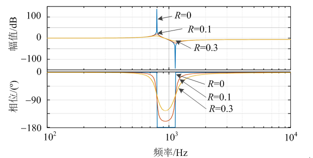 根據(jù)表3參數(shù)繪制的W2(s)W2(s)的Bode圖(圖5),可見即使PWM單元是理想的受控電流源,iSiS依然會(huì)在ωn=1/(L+LS)C−−−−−−−−−−−√ωn=1/(L+LS)C處產(chǎn)生并聯(lián)諧振,通過在PWM單元的電容支路串聯(lián)阻尼能有效地起到抑制諧振峰的作用[17],阻尼比ξ=(R/2)C/(L+LS)−−−−−−−−−−√ξ=(R/2)C/(L+LS)。