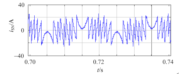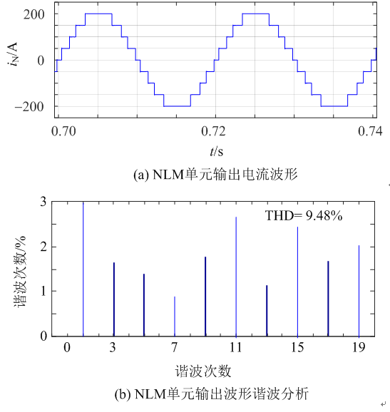 圖13(a)為NLM單元子模塊開關(guān)函數(shù),圖13(b)為NLM單元直流側(cè)分流電感上的電流波形,兩圖處于同一時(shí)間軸坐標(biāo),由于NLM單元輸出電流的