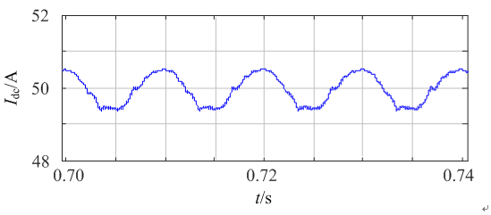 圖14為PWM單元直流側(cè)的電感電流波形,經(jīng)電流外環(huán)PI控制后,直流側(cè)電流在50 A周圍上下波動(dòng),基本穩(wěn)定在了50 A,確保了裝置的可靠運(yùn)行并平穩(wěn)地輸出諧波補(bǔ)償電流。