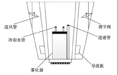 氣體分布器和霧化器的布置如圖3所示,熱空氣通過若干進風管和調(diào)節(jié)閥的控制均勻進入進風通道中,通過導流板的調(diào)節(jié)呈一定角度旋轉(zhuǎn)并與旋流霧化器出來的霧滴進行充分接觸和強烈的傳質(zhì)傳熱反應。