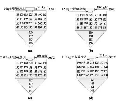 塔體溫度變化可以顯示不同區(qū)域內(nèi)脫硫廢水的蒸發(fā)特性,溫度下降越多,說明此區(qū)域蒸發(fā)反應越激烈。