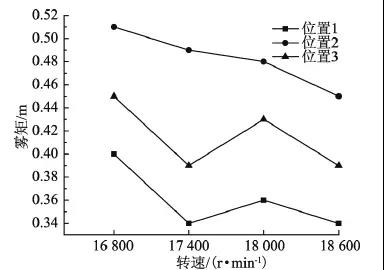 另外,霧矩的大小還有霧化器的轉(zhuǎn)速有關,如圖8所示。給液量為1.5kg˙h-1,隨著轉(zhuǎn)速的增加,霧矩呈減小趨勢。從圖中也可以看出,3個位置的霧矩差距較大,其源于霧矩的不均勻性。但在實際運行過程中,為了避免未蒸發(fā)液滴的粘壁,往往以最大霧矩作為設計與運行的依據(jù)。