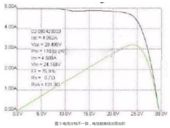 組件中電池片功率、電流分檔不一致,組件實際輸出功率與組件理論功率差異過大。分檔不一致會造成組件電性能測試曲線異常,引起熱斑效應(yīng),長時間使用會大幅降低組件功率。
